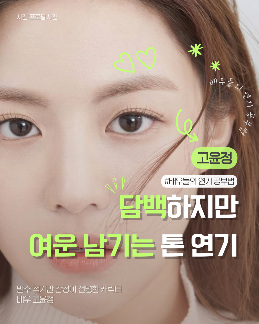 배우 곽선영 편 지금 시작합니다!"촬영이 즐거웠다는 것 자체가연기자로서 중요한 일이다." 배우 곽선영"저는 다 해보고 싶어요. 같은 피아노도누가 치느냐에 따라 소리가 달라지는 것처럼,저로 인해 인물이 더 생생하게 그려질 수 있다면,어떤 역할이든 다 할 수 있을 것 같아요.""인물이 살아온 세월과 역사를파악하는 걸 우선시한다." 배우 곽선영"역할 수행에 만족의 끝은 없다.만족하면 끝이니까" 배우 곽선영"거북이처럼 우직하게배우의 삶을 살고 싶다." 배우 곽선영